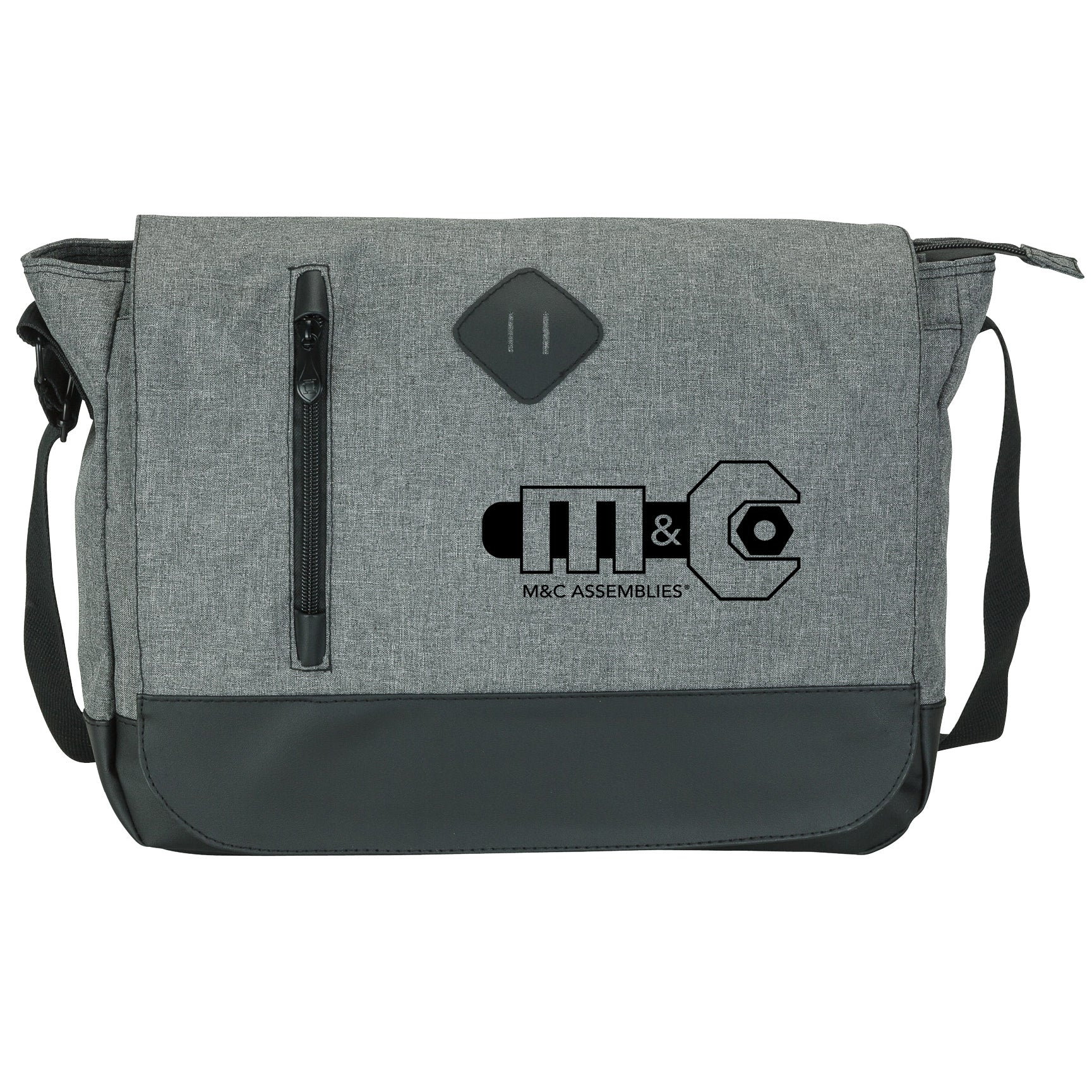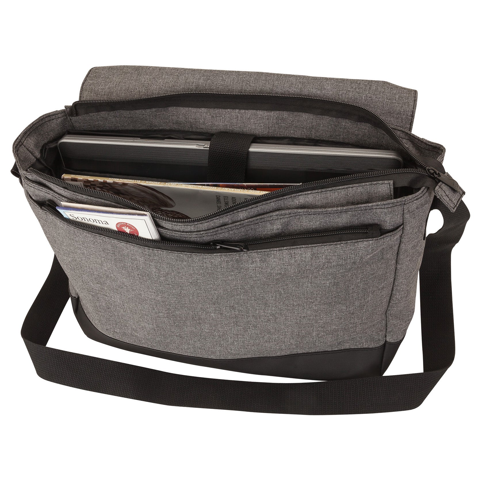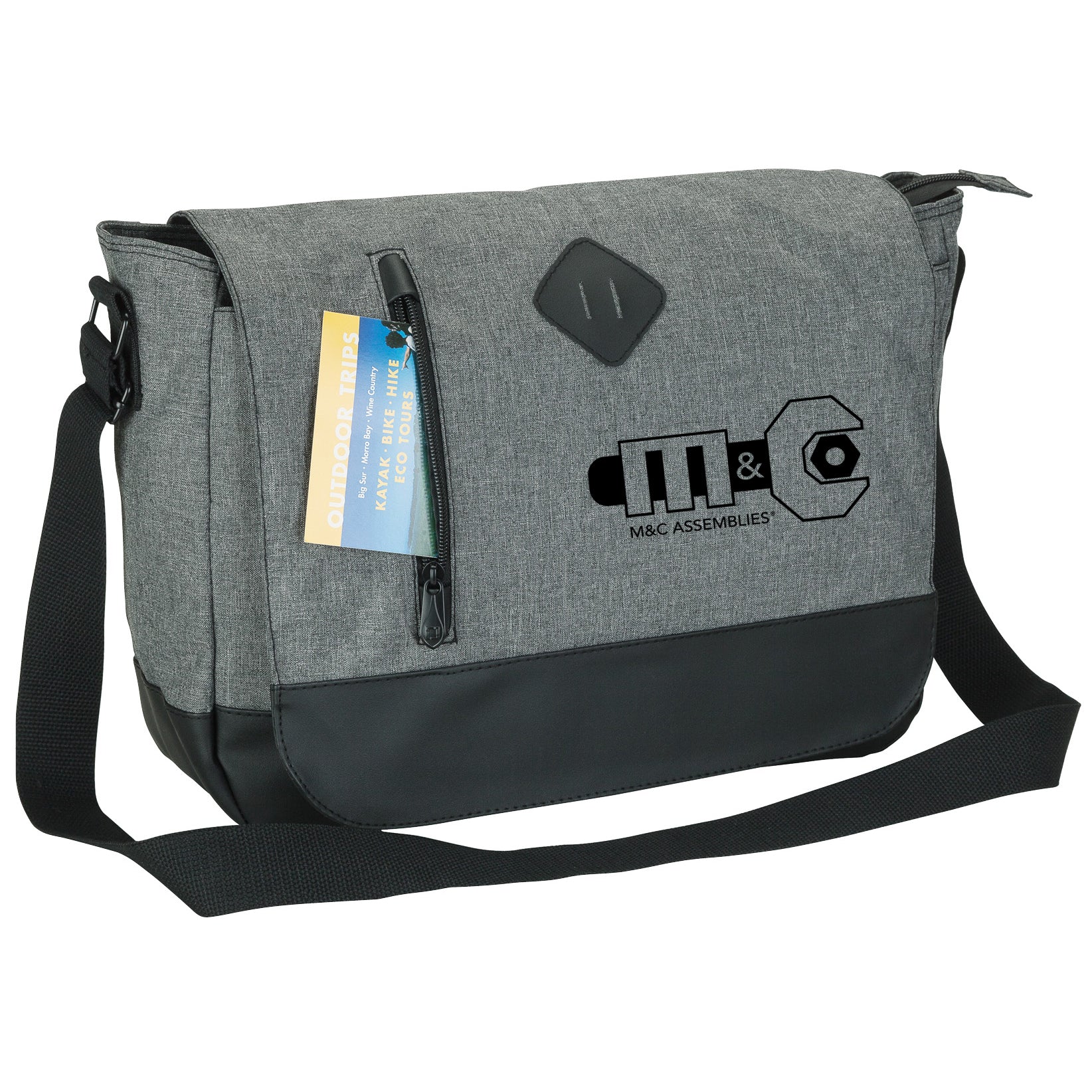 The Madison fully-lined messenger bag is made with comfortable denim-feel fabric with leatherette trim. The main compartment includes a padded pocket for small laptops and plenty of room for your files. The zippered inside pocket features an additional zippered interior pocket and organizers. Additional features include a front flap with magnetic closure and front zip pocket, metal hardware, pen holders, and a 1 1/2" x 50 3/4" adjustable shoulder strap.